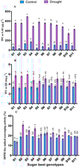 Secondary metabolites are natural compounds produced by the plant and can perform several physiological roles [36]. Secondary metabolites produced by plant cells have not only a significant role in their growth and development process under normal conditions, but also their production under stress can be regulated and used as defensive and tolerance mechanisms [21,37,38]. Also, changing environment can bring in significant change in metabolism and yield [39]. There is little information on sugar beet regarding the effect of drought on secondary metabolites, and their role in stress acclimatization is also unclear. Along with significantly increasing antioxidant activity in plant tissues, secondary metabolites (like polyphenol, flavonoids, and callose) may take part in a defensive role against both biotic and abiotic stress [40,41,42]. Therefore, evaluation of sugar beet seedlings based on antioxidant activity may play a pivotal role in selecting drought-tolerant germplasms for future breeding.