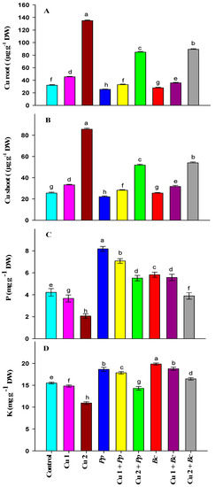 3.6. Bacterial Inoculation under Cu Stress Increases P and K Contents
