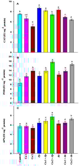- Sharma, P.; Sirhindi, G.; Singh, A.K.; Kaur, H.; Mushtaq, R. Consequences of copper treatment on pigeon pea photosynthesis, osmolytes and antioxidants defense. Physiol. Mol. Biol. Plant 2017, 23, 809–816. [Google Scholar] [CrossRef]