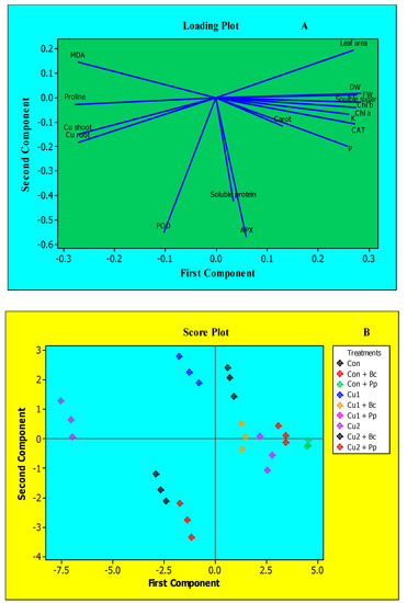 3.8. Understanding Interactions between Bacterial Inoculation, Various Cu Doses and Variables Studied through PCA Approach