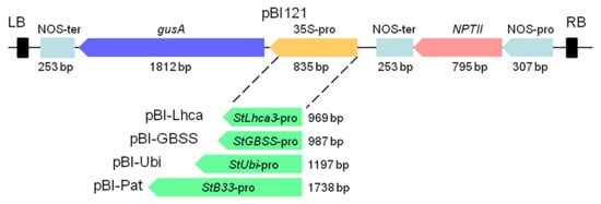 A modified binary construct pBI121 [29] in which the CaMV 35S promoter driving the gusA gene was removed was used to create constructs for transformation. Promoter fragments of the StGBSS, StPat, StLhca3, and StUbi were released from the relevant intermediate vectors and then placed upstream of the gusA reporter gene with the HindIII—XbaI (StGBSS) or HindIII—BamHI (StPat, StLhca3, StUbi) sites. The resulting constructs were designated as pBI-Pat, pBI-GBSS, pBI-Ubi, and pBI-Lhca (Figure 1) and were transformed into Agrobacterium tumefaciens strain AGL0.