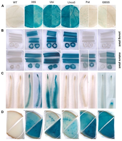 Expression pattern of gusA gene fused with the CaMV 35S, StUbi, StLhca3, StPat, and StGBSS promoters in various tissues of transgenic potato plants and untransformed potato plant (WT), including leaves (A), young and mature stems (B), roots (C), and tubers (D). The characteristic tissue samples are shown; distinctive variations of GUS activity, if observed, are presented for two samples taken from independent lines.