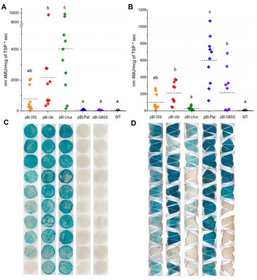 In contrast, tuber-specific promoters displayed extremely low fluorometric GUS activity (Figure 4A,C), which ranged from 11.8 to 75.0 units and from 28.4 to 110.5 units in leaf extracts of the lines with StGBSS and with StPat promoters, respectively. Due to low fluorometric values, the difference from the untransformed potato (WT) was not statistically significant for the majority of the lines (15 lines) transformed with the pBI-Pat and pBI-GBSS cassettes. Only a few independent lines with residual blue GUS staining in leaf tissues showed significantly higher GUS activity than WT; however, the fluorimetric values were lower than those observed for protein extracts of lines with the weakest gusA expression driven by the CaMV 35S, StUbi, and StLhca3 promoters (Table 2).