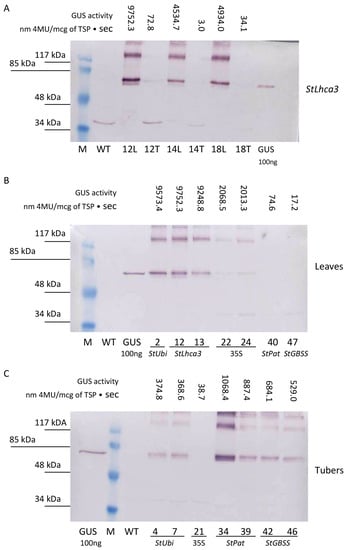 For a more detailed study of GUS accumulation, a comparative Western blot analysis was performed on protein extracts taken from the lines characterized by different levels of fluorometric GUS activity (Figure 5). The accumulation of GUS protein was clearly detected in the samples of total protein fractions extracted from leaves of transgenic lines carrying the gusA gene driven under the control of the StLhca3, StUbi, and CaMV 35S promoters (Figure 5A,B). As expected, no bands were recognized in leaf extracts of the lines carrying the inserts of the gusA fusion with the tuber-specific promoters StPat and StGBSS, as well as in the protein samples from wild-type potato. In general, the data from the Western blot analysis correlated with the fluorometric data. For example, a semi-quantitative comparison of the selected StLhca3-gusA lines showed that the intensity of bands was strongest for the leaves extracts, while it was hard to find the specific protein band in the tuber extracts (Figure 5A).