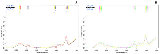 Identification of the functional groups can provide useful information on their mechanical and chemical properties [53]. Infrared spectroscopy is used to characterize the specific kind of bounds and the functional groups. The FTIR spectrum of crude plant extracts (prepared in methanol and water) are given in Figure 1A,B. The data of peak values and the possible functional groups of saponins from other literatures are presented in Supplementary Materials. FTIR spectrum of crude methanol or water extracts of the three detergent plants (A. concinna, S. rarak, and L. glutinosa) absorbed light at the wavenumber ranges of 1025–1620 and 2923–3338 cm−1. All detergent plant extracts showed characteristic infrared absorbance of the hydroxyl group (OH) at ~3338.65 cm−1 and ~3330.55 cm−1 in methanol extracts of A. concinna and S. rarak and the aqueous extracts gave the peaks at wave numbers at ~3335.52 cm−1 and ~3261.94 cm−1 of A. concinna and L. glutinosa, respectively. Carbon–hydrogen (C-H) absorption was found at 2923.23 cm−1 only in methanol extract of L. glutinosa. The C=C absorbance was observed at 1620.33 cm−1 (A. concinna) and 1606.13 cm−1 (L. glutinosa) in the water extracts but was not found in the both extracts of S. rarak. Whereas C-O-C absorbance varied from 1035.12 cm−1 (S. rarak) to 1026.26 cm−1 (A. concinna) in the methanol extracts and in the crude aqueous of S. rarak ~1034.78 cm−1 and 1033.22 cm−1 in L. glutinosa.