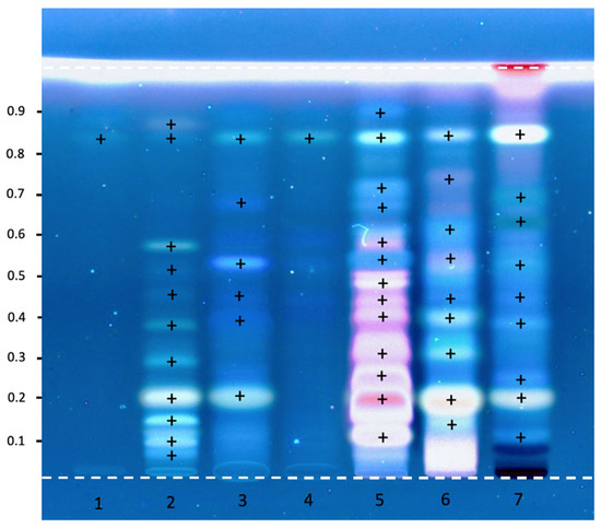 The HPTLC chromatogram of the crude methanolic of detergent plants after derivatized viewed under UV 366 nm. Track 1 = standard Diosgenin, 2 = standard Quillaja saponin, 3 and 4 = Callus of Litsea extracts, 5 = Sapindus extract, 6 = Acacia extract, 7 = Litsea extract. The symbol (+) indicate the presence of bands on each track.