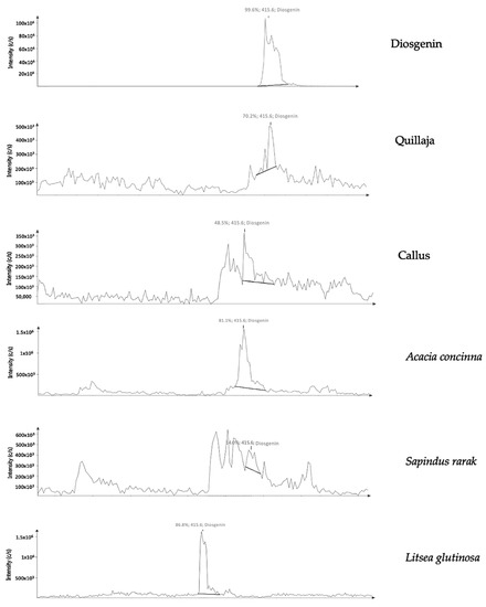 The experiment was performed using the expression Compact Mass Spectrometer and Atmospheric Solids Analysis Probe (ASAP) from Advion, Inc. (Ithaca, NY, USA) to measure the presence of saponin compounds contained in the complex matrix including methanol extracts of detergent plants, callus of selected detergent plant in comparison with the standards following the standard protocol of Perez-Hurtado et al. [78]. The instrument was operated in positive ionization mode. All the spectra were acquired within the range of m/z 400–430.