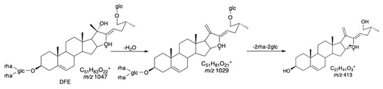 - Li, R.; Zhou, Y.; Wu, Z.; Ding, L. ESI-QqTOF-MS/MS and APCI-IT-MS/MS analysis of steroid saponins from the rhizomes of Dioscorea panthaica. J. Mass Spectrom. 2006, 41, 1–22. [Google Scholar] [CrossRef]