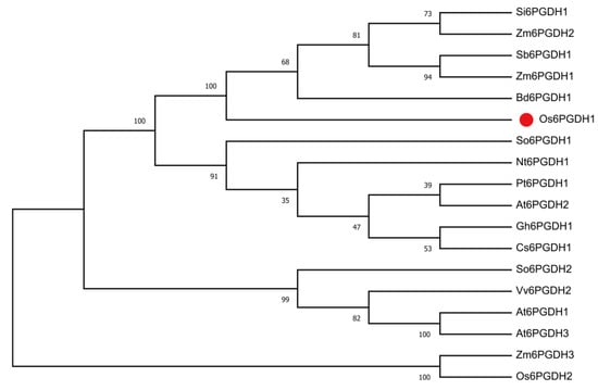 Phylogenetic analysis of 6PGDH proteins from different plant species. The plant species and NCBI accession numbers used in phylogenetic analysis are as follows: Oryza sativa Os6PGDH1 (XP_015642949.1), Os6PGDH2 (XP_015616899.1); Setaria italica Si6PGDH1 (XP_004971196.1); Sorghum bicolor Sb6PGDH1 (XP_021305860.1); Brachypodium distachyon Bd6PGDH1 (XP_003557150.1); Zea mays Zm6PGDH1 (NP_001266302.1), Zm6PGDH2 (NP_001104910.2), Zm6PGDH3 (NP_001241786.2); Populus trichocarpa Pt6PGDH1 (XP_006373519.1); Arabidopsis thaliana At6PGDH1 (NP_176601.1), At6PGDH2 (NP_186885.1), At6PGDH3 (NP_198982.1); Vitis vinifera Vv6PGDH2 (XP_002275970.1); Gossypium hirsutum Gh6PGDH1 (XP_016740720.1); Cucumis sativus Cs6PGDH1 (XP_004141482.1); Nicotiana tabacum Nt6PGDH1 (AKB09093.1); Spinacia oleracea So6PGDH1 (AAK51690.1), So6PGDH2 (AAK49897.1). The Os6PGDH1 is indicated with a red dot ‘●’.