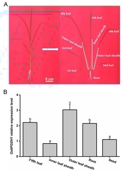 Transcriptional analysis revealed that Os6PGDH1 was widely expressed in all rice tissues, with the highest expression level in outer leaf sheaths, followed by roots and leaves. In comparison to other tissues, inner leaf sheaths and seeds showed the lowest expression of Os6PGDH transcripts (Figure 2).
