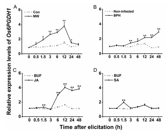 Transcript levels of Os6PGDH1 in rice after different treatments. Relative transcript levels (mean + SE, n = 5–6) of Os6PGDH1 in rice outer leaf sheaths that were mechanically wounded (MW) (A), infested with gravid BPH females (BPH) (B), or treated with JA (C) or SA (D). Con, nonmanipulated rice plants; BUF, buffer. Asterisks indicate significant differences between treatments and controls (* p < 0.05, ** p < 0.01, Student’s t-test).