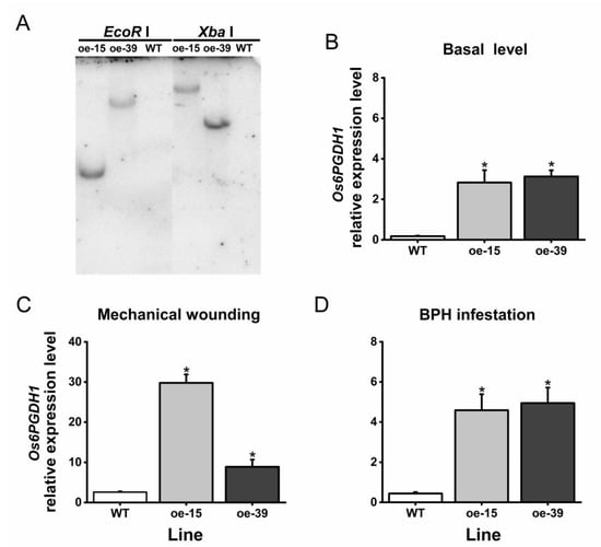 Molecular confirmation of transgenic lines overexpressing Os6PGDH1. (A) Southern blot of Os6PGDH1-overexpressing lines and WT plants. Genomic DNA from oe-15, oe-39, and WT plants was digested with EcoR I and Xba I, respectively. Digested genomic DNA was hybridized to a specific GUS probe. (B) Basal expression levels (means + SE, n = 5) of Os6PGDH1 in oe6PGDH lines and WT plants; (C,D) relative transcript levels (means + SE, n = 5) of Os6PGDH1 in oe6PGDH lines and WT plants that were mechanically wounded or infested by gravid BPH females for 12 h (these experiments were performed separately). Asterisks indicate significant differences in oe6PGDH lines compared with WT plants (one-way ANOVA followed by Duncan’s multiple range test, p < 0.05).
