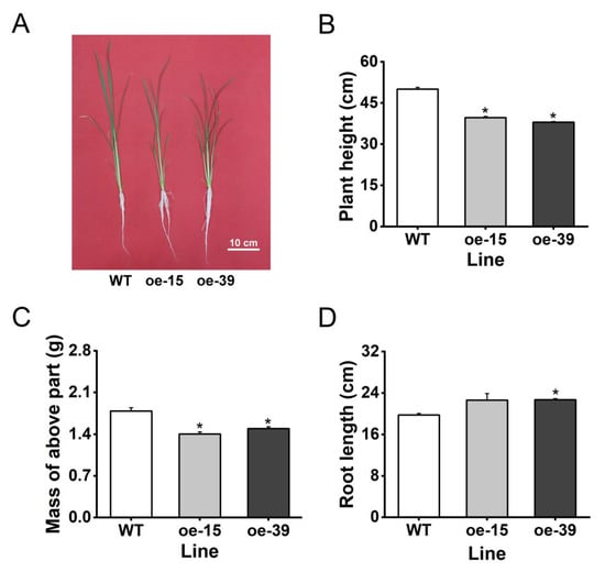Compared to WT plants, oe6PGDH plants exhibited lower height and mass of aboveground parts (Figure 5A–C). However, the root length increased in oe6PGDH plants compared to WT plants, although no significant difference in root length was observed between oe-15 plants and WT plants (Figure 5D). The results indicate that Os6PGDH1 regulates rice growth and development.