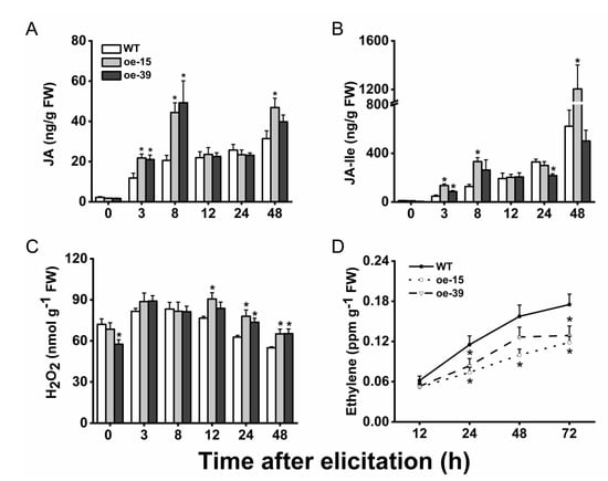 It has been well documented that JA, JA-Ile, SA, ethylene, and H2O2 play a key regulatory role in defense responses of rice against BPH [,,]. To test whether Os6PGDH1 influences the biosynthesis of signal molecules, we examined the levels of these molecules in transgenic and WT plants post-infestation with gravid BPH females. Similar to previous findings [,], infestation with gravid BPH females induced the production of JA and JA-Ile during the whole tested period (Figure 6A,B). Overexpression of Os6PGDH1 enhanced the BPH infestation-induced accumulation of JA (3, 8, and 48 h post-infestation) and JA-Ile (3, 8, and 48 h), although such phenomena were observed in one oe6PGDH line only at certain time points (Figure 6A,B). Overexpressing Os6PGDH1 also increased BPH-elicited levels of H2O2 at 12, 24, and 48 h after infestation (Figure 6C). In contrast, levels of ethylene emitted from oe6PGDH plants were significantly lower than those from WT plants at 24, 48, and 72 h post-infestation (Figure 6D). BPH-induced SA levels in oe6PGDH lines were similar to those in WT plants (Figure S4). These results suggest that in rice, Os6PGDH1 is involved in the biosynthesis of BPH-induced JA, JA-Ile, H2O2, and ethylene, but not SA.