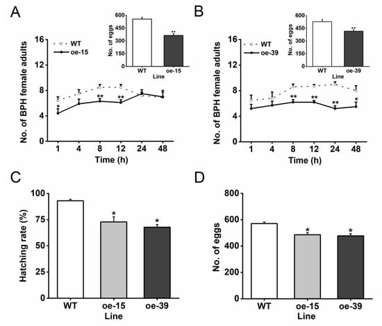 Os6PGDH1 positively regulates rice resistance to BPH. (A,B) Mean number (+SE, n = 10) of gravid BPH females per plant on pairs of plants (WT versus oe-15 (A) and oe-39 (B)). Insert: Mean number (+SE, n = 10) of eggs per plant on pairs of plants as stated above. Asterisks indicate significant differences between oe6PGDH and WT plants (* p < 0.05, ** p < 0.01, Student’s t-test). (C) Mean hatching rate (+SE, n = 10) of eggs on oe6PGDH plants and WT plants. (D) Mean number (+SE, n = 30) of eggs laid by one pair of BPH female and male adults that emerged from oe6PGDH or WT plants. Asterisks indicate significant differences in oe6PGDH lines compared with those in WT plants (one-way ANOVA followed by Duncan’s multiple range test, p < 0.05).