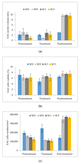 The impact on the number of cells compared to the EAC control group was statistically significant only in groups of animals that were pretreated with SD and an increase in the number of cells was determined. In the treatment with SD1, the same effect was recorded—a significant increase in the number of cells, while the administration of SC extracts led to a mild reduction (statistically insignificant) in the number of malignant cells. In the post-treated groups, there was an increase recorded after the application of all extracts (Figure 1c; Table A3).