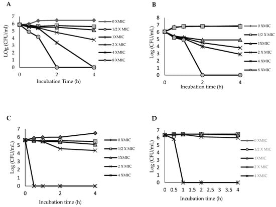 A time–kill assay, using the four bacterial strains, was performed for the leaf EtOAc fraction since it exhibited a stronger antibacterial activity in comparison to the other fractions. Although MIC value gives a good indication of the efficacy of an antimicrobial agent, it provides limited information on the kinetics of the antimicrobial action [19]. A better method of assessing the bactericidal or bacteriostatic activity of an antimicrobial agent over time is by using time–kill kinetics assay, where the effect of various concentrations of the antimicrobial agent over time in relation to the growth stages of the bacteria is monitored [20]. The bacterial strains were thus exposed to the EtOAc fraction, at test concentrations of 0, 0.5, 1, 2, 4 and 8 × MIC over a period of 4 h, and the time–kill curve was plotted. The assay results for MRSA ATCC 700699 (Figure 1A) revealed that the bacteria were completely killed after 4 h when a concentration of 4 × MIC (0.63 mg/mL) was used and after 2 h with the higher concentration of 8 × MIC (1.25 mg/mL). In terms of practical application, the 4 h killing time would be more preferred since the effect was obtained using a lower concentration (0.63 mg/mL) of the disinfecting agent. This condition is similar to that of a drug that exhibits a concentration-dependent bactericidal action, where the bactericidal effect is dependent on the dose of the leaf EtOAc fraction rather than on incubation time [21]. On the other hand, the time–kill curves for MRSA KCCM 12255 (Figure 1B) showed that the time–kill endpoint was achieved after 2 h incubation with a higher concentration of 8 × MIC (2.5 mg/mL). Meanwhile, in the case of the clinical isolates, as illustrated in Figure 1C,D, the time–kill endpoint could only be achieved with a concentration of 4 × MIC (5 mg/mL) after 1 h of incubation.