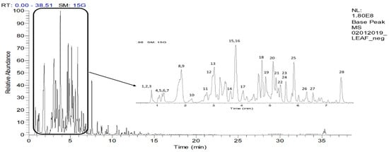 UHPL-ESI-MS/MS base peak chromatogram of the leaf EtOAc fraction of A. pavarii in negative ion mode.