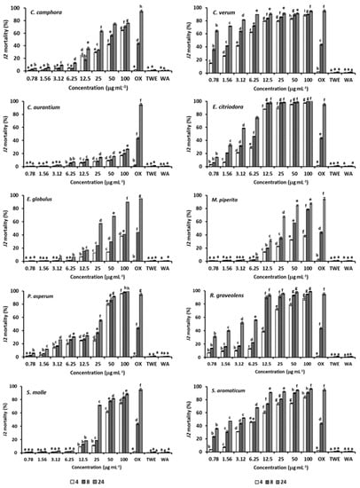 Mortality (%) of M. incognita J2 after 4, 8 or 24 h exposure to a 0.78–100 μg mL−1 range of concentrations of the ten tested EOs. Data are means of four replicates. At each exposure time, bars marked with the same letter are not significantly different (p ≤ 0.05) according to the least significant difference test.