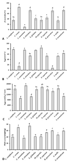 EOs’ aggregated effects on J2 mortality (A), egg hatchability (B), M. incognita multiplication on roots (C) and tomato growth (D). Bars marked with the same letters are not significantly different according to Least Significant Difference Test (p ≤ 0.05).