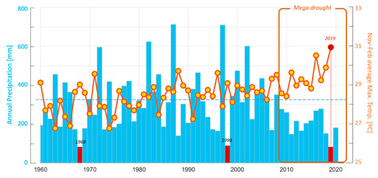 Variability and trends in central Chile’s hydroclimate since 1960. The light-blue bars are the annual precipitation for the city of Santiago (Quinta Normal) from 1960 up to the early spring of 2020 (and hence including the previous winter months when most precipitation is received). The horizontal dashed line is the long-term mean. Extreme drought years for the period (highly reduced precipitation in the winter months) of 1968, 1998 and 2019 are highlighted in red. The central Chile mega drought (from 2010 onwards) is also identified. The orange line with yellow circles gives the average daily maximum temperature over the late spring–early summer months (November–December) for a given calendar year and the mid–late summer months (January–February) for the following calendar year (so as to capture the austral summer). All values are plotted with respect to the calendar year of November and December The last summer season (November–December 2019, January–February 2020) is highlighted by the red dot, which according to the convention adopted, is plotted for the year 2019. The last value is representative of the 2020 austral summer. Data source: downloaded from the CR2 climate explorer (http://explorador.cr2.cl/).