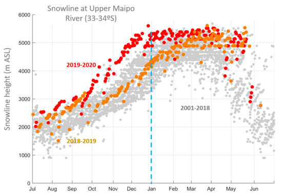 Annual cycle and interannual variability of the snow-line in central Chile (upper Maipo river basin) close to our study area over the past decades (grey circles). Each circle is a given day in a year. The period July 2018–June 2019 is highlighted in orange and the period July 2019–June 2020 (extreme drought) is highlighted in red.