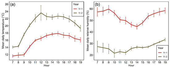 Average (+1SE) hourly daytime temperature (a) and relative humidity (b) between 7 h (7 a.m.) and 19 h (7 p.m.) standard time over the study periods in February 2019 (Yr-1) and 2020 (Yr-2) based on the authors’ onsite recordings.