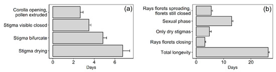 Potential floral longevity in M. subulata. (a) Duration of the male, neutral (stigmas emerging, not bifurcate), receptive stigma and dry stigma stages of individual florets (Mean + SE, N = 25). (b) Total longevity of pollinator-excluded flowers-heads (Mean + SE, N = 15) showing the duration of different stages.