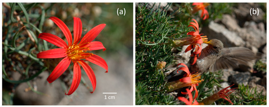 (a) Typical flower-head of M. subulata fma. rosmariniifolia (Asteraceae) showing the brilliant red ray florets, disk florets with golden-yellow corollas, dark red elongate stigmas and abundant yellow-orange pollen being extruded by the florets. (b) Oreotrochilus leucopleurus (White-sided Hillstar hummingbird—Picaflor de Cordillera) visiting an exceptionally dense patch of M. subulata on the study site. The stems of M. subulata are growing between the branches of short-statured shrubs of Ephedra chilensis. Images: Mary T. K. Arroyo.