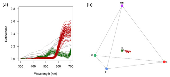 (a) Spectral reflectance of ray florets and leaves of M. subulata and of stones against which flower-heads are likely to be detected by pollinators given the low disposition of the flower-heads. (b) Distribution of ray floret, leaf and stone colours in the avian tetrahedral space considering the standard avian colour vision system with VS, S, M and L type cones which correspond to cones maximally sensitive to violet, blue, green and light red, respectively. Lines and symbols: red = ray florets; green = foliage; grey = stones.