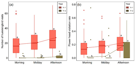 Both year and period of the day and their interaction had highly significant effects on the frequency of visits (Table 2). Although we found an overall difference in the number of visits among the three periods of the day (χ2 = 10.107, p = 0.0064, Kruskal–Wallis test), for the individual years such differences were not statistically significant (Figure 7a). Overall the number of visits per day in Yr-1 was 36.5 times higher than in the much drier and warmer Yr-2. The percentage of total flights (which can be with or without visits) into the sampling areas that involved visits was higher in Yr-2 (80%) than in Yr-1 (52.5%), indicating that the birds dedicated relatively more of their time to collecting nectar in Yr-2. When we separated the sample of 168 flowering heads mentioned in Section 4.1 according to year (Yr-1, N = 100, Yr-2, N = 68), flower-head diameter and disk floret number were not significantly different among years (flower-head diameter: Mann–Whitney U-test, U = 3167.5, p = 0.45; disk floret number, Mann–Whitney U-test, U = 3850, p = 0.145), although for the same flower-heads, rays floret number was larger in Yr-2 (Mann–Whitney U-test, U = 2478.5, p = 0.002). Thus, differences in visitation frequency cannot be put down to larger and more attractive flower-heads in Yr-1. We recorded between one and—exceptionally—36 probes, on a single flower-head visit. However, the number of probes per flower-head was significantly lower in Yr-2 (median three in Yr-2 versus five in Yr-1; Mann–Whitney U-test, U = 28436, p = 0.0248, Yr-1, N = 551; Yr-2, N = 48).