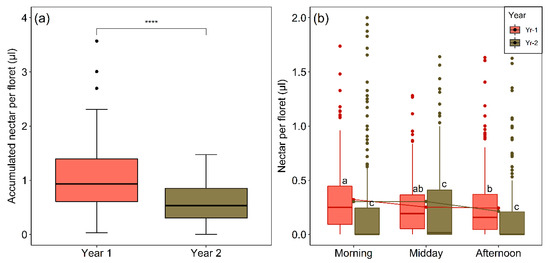 (a) Amount of nectar accumulated in individual florets in pollinator-excluded flower-heads of M. subulata over the last two years of the Chilean mega drought (Yr-1, N = 88; Yr-2, N = 77). The four asterisks (****) indicate a significant difference between years (p < 0.0001) based on the Mann–Whitney U-test. (b) Nectar standing crop per floret for the two years over different periods of the day (Yr-1, N = 735; Yr-2, N = 570). Outliers (values higher than 1.5 times the interquartile range above the upper quartile) are shown as dots. Four outliers were excluded from (b) to facilitate visual presentation. Note that these outliers were not excluded from the statistical analysis. Lower case letters indicate significant differences (p < 0.05) according to Dunn’s test.