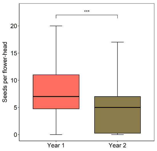 Seed (achene) set per flower-head was significantly higher in Yr-1 (Figure 9). In relative terms, the absolute number of seeds per flower-head in Yr-2 was 31% lower compared to Yr-2. In terms of seeds per ovule, seed set dropped from an average of 36.2 to 26.7%. At a smaller spatial scale, as was suspected, seed set per flower and the seed/ovule ratio tended to increase with increasing floral density as per in the 15 × 15 m observation plots, although in both cases the tendencies failed to be significant (seed set per flower-head, R = 0.460, p = 0.252; seeds per ovule per flower-head, r = 0.444, p = 0.271, d.f. = 6 in both cases). The lower seed set in Yr-2 is partially due to a higher percentage of the heads that year not having any seeds at all (Yr-1 = 6.8%, Yr-2 = 25.8%, χ2 = 13.8366, p < 0.001). Considering only the flower-heads that had some seeds, the seed set in Yr-1 heads was marginally higher than in Yr-2 (Mann–Whitney U Test, U = 2498, p = 0.080, Yr-1, N = 123, Yr-2, N = 49).