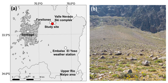 (a) Location the study site (red filled circle) at 2400–2450 m.a.s.l. in the Andes east of the city of Santiago, Metropolitan Region, Chile. Also shown are other localities mentioned in the text. (b) View of the subalpine slopes where the work was carried out. Image: Mary T. K. Arroyo, taken in Yr-1 on 21 February 2019.