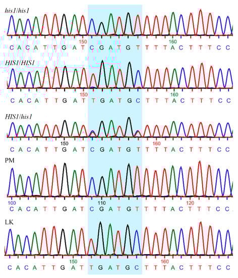 Chromatograms of Sanger sequencing showing partial HIS1 sequence and the target used (highlighted) for genotyping the different weedy rice accessions. Rice varieties known for their susceptibility (PM) and tolerance to benzobicyclon (LaKast) were used as reference. his1/his1: homozygous susceptible; HIS1/HIS1: homozygous resistant; HIS1/his1: heterozygous; PM: Purple Marker; LK: LaKast.