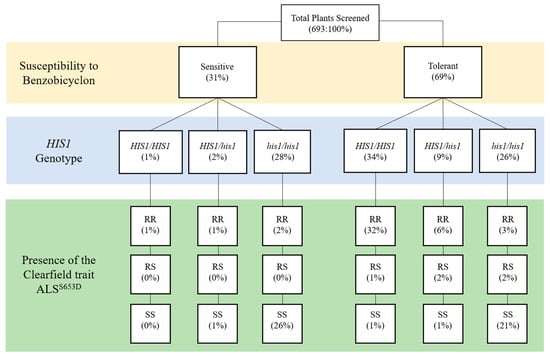 In Arkansas, Clearfield-resistant japonica rice with the ALSS653N mutation has high market penetration []; however, owing to gene flow, IMI-resistant weedy rice is now a widespread issue in many grower fields []. Interestingly, the ALSS653N trait and the HIS1 loci are localized to the lower half of chromosome two in the rice genome. Here, we are not interested in the severity of IMI-resistant weedy rice, but what is the probability the ALSS653N and the HIS1 genes co-segregate in the likely event of gene flow between weedy rice and the japonica cultivars grown in Arkansas. Thus, the 693 plants genotyped for HIS1 were also genotyped for the presence or absence of the ALSS653N trait using a KASP assay []. Figure 2 classifies plants by their biological response to benzobicyclon and their subsequent genotype for HIS1 and ALSS653N. As expected, IMI-resistant weedy rice was a common genotype in 22 out of the 37 accessions (Table 1) and, in fact, 344 out of 693 plants screened contained at least one copy of the ALSS653N (homozygous resistant (RR) and heterozygous (RS)) trait (Figure 2). The probability that the ALSS653N trait and HIS1 co-segregate was found to be high (ꭓ2 = 456, p < 0.0001). In the 344 plants with at least one copy of the ALSS653N trait, 86% also harbored a HIS1 allele. These results suggest that IMI resistance in weedy rice obtained via gene flow from the commonly grown japonica cultivars in the midsouth United States could be used as an indicator for predicting the tolerance of weedy rice to benzobicyclon.