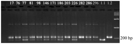 Electrophoregram of genomic DNA amplification products with RM 493: 1.1, Novator; 1.2, NSIC Rc 106; 17–296, hybrid plants NSIC Rc 106 × Novator; DNA marker (100–1500 bp).