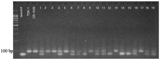 Electrophoregram of the amplification products of rice genomic DNA with the primer RM 4781. 1–19, F2 (Novator × CR-1009); TDK-1 and CR-1009, donor of the Sub1A gene. Molecular weight marker, 1 kb.