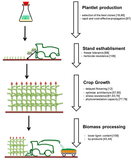 - Cavallaro, V.; Tringali, S.; Patanè, C. Large-scale in vitro propagation of giant reed (Arundo donax L.), a promising biomass species. J. Hortic. Sci. Biotechnol. 2011, 86, 452–456. [Google Scholar] [CrossRef]