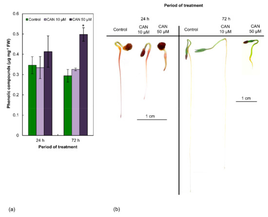 (a) The content of total PCs in roots of tomato plants grown in water (control) or supplemented with 10 or 50 µM CAN after 24 and 72 h of culture. Data were obtained in four independent experiments with three repetitions each. Asterisks (*) indicate significance between treatments and the control at the same time of culture period at p ≤ 0.05, based on Student’s test. (b) Localization of PCs (by Reeve’s method) in roots of tomato plants grown in water (control) or supplemented with 10 or 50 µM CAN after 24 and 72 h of culture. Data were obtained in three independent experiments, 10 roots from each treatment were used for localization of PCs.