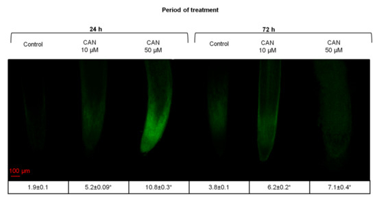Localization of flavonoids with DPBA in roots of tomato plants grown in water (control) or supplemented with 10 or 50 µM CAN after 24 and 72 h of culture. Fluorescence intensity is shown in the table. Asterisks (*) indicate significance between treatments and the control at the same time of culture period at p ≤ 0.05, based on Student’s test. Data were obtained in three independent experiments, 10 roots from each treatment were used for flavonoid localization.