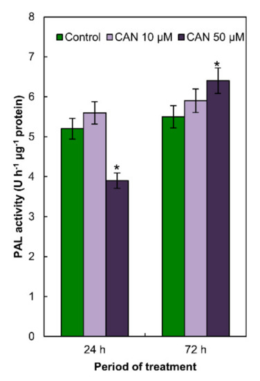 PAL activity in the roots of control plants and roots of plants exposed to 10 µM CAN did not differ and was constant during the whole period of the experiment (Figure 3). CAN at higher (50 µM) concentration decreased (in 20%) PAL activity after short-term (24 h) treatment, while prolongation of the CAN application increased (in 20%) PAL activity in tomato roots (Figure 3).