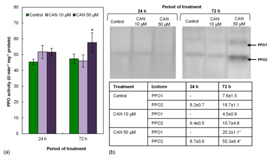Activity of PPO measured by a spectrophotometric method in root extracts of control plants was around 45 U min−1 mg−1 protein and remained constant during the experiment (Figure 4a). Short-term (24 h) treatment of tomato seedlings with CAN did not influence activity of PPO measured by the spectrophotometric method. Prolongation of the feeding of the plants with CAN increased PPO activity but only in extracts of the roots exposed to 50 µM CAN (Figure 4a).