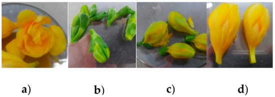 Bud (S1) and full-bloomed (S2) stages of cultivars used in the study; (a) “Shiny Gold”, (b) “Yvonne”, (c)’10C3-894′ and (d) “10C3-424”.