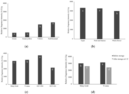 Relative scent intensity using mobile e-nose sensor in (a) developmental stages of “Shiny Gold”; (b) floral tissues of “Shiny Gold”; (c) four Freesia cultivars and (d) “Shiny Gold” and “Yvonne” after storage at 4 °C. Different letters indicate significant differences among means according to ANOVA analysis (p < 0.05).