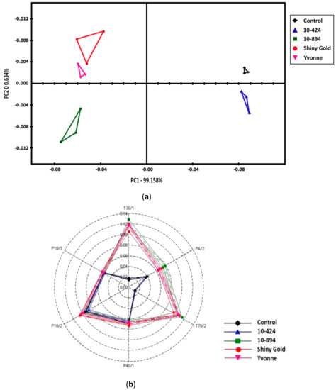 Relative scent intensity was measured and validated using two e-nose sensors (e-nose, Alpha MOS and mobile e-nose, FATUBA). Principal component analysis using e-nose (Alpha MOS) showed that (Figure 3a), PC1 and PC2 captured the largest percentage of variation. The first principal component, PC1, represents 99.2% and PC2, represents 0.6% of the total variance (99.8%). The relative intensity is the measure of Euclidean distance between the centroid of control and samples. In Figure 3a, the three replicates of control clustered into a small group, which indicates the uniformity of samples without variation. From Figure 3b, the response intensity was lowest in 10C3-424, which was similar to control (air). Therefore, we could assume that the “10C3-424” cultivar has a weaker scent compared to other cultivars. Further, the small clusters formed from replicates indicate the reliability and reproducibility of the tests. In the PCA plot, we could see that each cultivar had clustered at different quadrants, which may be indicative of each cultivar’s unique scent pattern. As expected, scented cultivars clustered distantly from control, whereas the weakly scented “10C3-424” was found in close proximity with the control. In addition, PCA categorizes samples based on relative intensity without considering the amount of volatile compounds [19]. Earlier studies have shown that e-nose sensors clusters unscented or less scented near control [20]. The radar plot showed significant variation in pattern between the cultivars. In the radar plot among the six sensors, four sensors, namely T30/1, PA/2, T70/2 and P10/2, showed a higher response (Figure 3b). Combining the response outlined above, these sensors show their greater affinity towards organic solvent, volatile compound, fluoride/chloride and lesser response for nonvolatile compounds. The sensor data (Figure 3c) denoted that “Shiny Gold” and “Yvonne” had the same relative intensity (0.14), “10C3-894” had the highest relative intensity (0.15), whereas “10C3-424” showed the least relative intensity (0.01).
