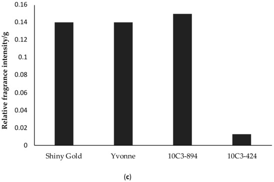 The following are available online at https://www.mdpi.com/2223-7747/9/11/1597/s1, Table S1: E-nose analytical conditions, Table S2. GC-MS analytical conditions, Table S3. Details of the primers are listed in the table, Table S4. Chromatogram of ‘Shiny Gold’, ‘Yvonne’, ‘10C3-894’ and ‘10C3-424’ obtained from GC-MS analyses.