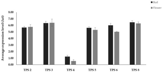 Average expression of TPS genes in “Shiny Gold” during flowering stages. Y-axis shows the average expression level (∆ct) in gene expression relative to the reference gene (ASK1). Bars represent mean ± SD, n = 3.