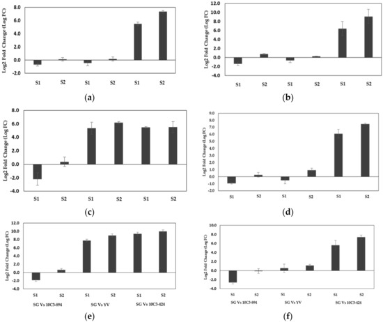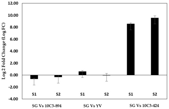 Studies in Freesia have shown linalool as the major volatile compound [15,16,32,33]. Linalool synthase (LIS) catalyze linalool [22]; therefore, LIS gene expression was checked in strong and weak scented cultivars (Figure 6). As expected, the results showed the highest expression in “10C3–894”, followed by “Shiny Gold” and “Yvonne”, which were strong-scented cultivars. “Shiny Gold” showed higher expression in S1, whereas, in “Yvonne”, S2 showed higher expression. In the weak scented cultivar (“10C3-424”), the expression of the LIS gene was downregulated in both S1 and S2. Previous studies have shown that though Clarkia breweri and Clarkia concinna have a functional linalool synthase gene, only Clarkia breweri emits linalool. The difference between linalool emitter and non-emitter is suggested to be due to the differences in the regulation of LIS gene expression [22]. Our results concur with this. Our study showed that linalool is a major volatile compound in Freesia and is controlled developmentally. Further, these results may be useful for selecting ideal parents for breeding and manipulating volatile profiles, which may enhance the commercial value of Freesia. Moreover, Freesia emerges in diverse colors, wherein certain pink and purple colored cultivars are considered attractive, but they lack scent [5]. Manipulating TPS gene expression with recombinant DNA technology could be exploited for inducing scent in such cultivars.