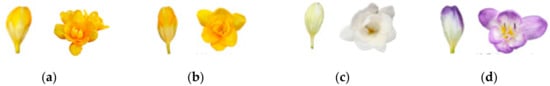 Freesia cultivars were grown in a glasshouse maintained at 8–25 °C in NIHHS, RDA, South Korea. Four cultivars were used in the study, namely, “Shiny Gold”, “Yvonne”, “10C3-894”, and “10C3-424” (Figure 7). They were selected based on the following criteria: “Yvonne” was selected as it was cultivated widely in Netherland and also possesses a strong scent like “Shiny Gold”. “10C3-894” was included for a very strong scent while “10C3-424” for weak scent.